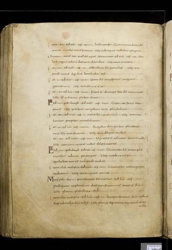 | Keywords: MCC-61050 Evangeliarium (Lebuïnuscodex) (288).jpg Artwork nl Anonymous Noordoost-Frankrijk Anonymous Rijnland Anonymous Maasland nl De kern van de boekband van de Lebuïnuscodex wordt gevormd door twee eikenhouten platten De rug en het achterplat zijn overtrokken met zeemleer Het voorplat is rijkelijk versierd met verguld zilversmeedwerk reliëfs van walrustand en verscheidene stenen De compositie van de bekleding van het voorplat wordt bepaald door een verguld zilveren filigraankruis Aan de uiteinden van de kruisarmen bevinden zich vierpassen met overhoeks vierkant eveneens met filigraan gedecoreerd Hiervan zijn er slechts twee bewaard gebleven en wel die aan de verticale kruisarmen Zij bevatten tevens nog de oorspronkelijke versiering bestaande uit een filigraanmedaillon met een pseudo-camee van respectievelijk een mannen- en een vrouwenhoofd in profiel Het snijpunt van het kruis wordt ingenomen door een ver vooruitstekend Bacchuskopje in chalcedoon te herkennen aan de kleine druiventrosjes in zijn haartooi Het kopje is gevat in een filigraanmedaillon welke op zijn beurt weer is geplaatst op een vierpas van filigraanwerk Op elk van de kruisarmen bevindt zich een ovale steen 'en cabochon' op een medaillon met filigraan Het filigraanwerk van kruis en sierstukken is in de vorm van visblazen In de ruimten tussen de kruisarmen zijn rechthoekige reliëfs van walrustand aangebracht met de vier evangelisten en hun symbool De reliëfs hebben de volgende afmetingen H 10 0 x B 5 5 cm Van links boven naar rechts onder betreft het Mattheus met de engel Johannes met de adelaar Marcus met de gevleugelde leeuw en Lucas met de gevleugelde os De figuren zijn paarsgewijs als elkaars spiegelbeeld ten opzichte van de middenas geplaatst Mattheus en Johannes zitten vrijwel geheel frontaal terwijl Marcus en Lucas meer in profiel zijn afgebeeld Qua opbouw verschillen de vier reliëfs nauwelijks van elkaar Binnen een rand van vierlobbige blaadjes verheffen zich twee zuilen met een basis een kapiteel en een dekplaat Hierop rust een rondboog geflankeerd door twee torens en afgedekt met een fronton dat boven Mattheus en Johannes boogvormig en boven Marcus en Lucas driehoekig is Onder deze overhuiving zitten de evangelisten gekleed in een lang gewaad en mantel met gekruiste benen aan een lessenaar hun blote voeten rustend op een bankje Allen zijn baardeloos en voorzien van een nimbus Voorts houden ze een pen in hun rechterhand terwijl hun linker op een boek ligt of gebarend is opgeheven Boven elk van de evangelisten verschijnt in de opening van het fronton zijn symbool met een spreukband Dit rijkelijk gedecoreerde middenveld wordt omlijst door sierbanden van verguld koper De opbouw van de sierlijsten is steeds dezelfde een opstaande smalle band die op regelmatige afstanden is voorzien van holten met aan weerszijden een brede strook voorzien van een gestanst motief Aan de lange zijden van de boekband bestaat het motief uit palmetten aan de korte zijden uit rozetten Van deze laatstgenoemde stroken ontbreekt steeds de buitenste rand Bij alle stroken met palmettenmotief wijzen de palmetten naar links met uitzondering van de buitenste strook rechtsboven die het motief in tegengestelde richting toont Verguld zilveren rozetten op de hoeken van het voorplat omgeven door een smalle rand van filigraanwerk met cirkelmotief en bekroond met een 'en cabochon' gezette steen completeren het geheel Van de rozet links onder ontbreekt de steen en is slechts de buitenste rand over Aan de voorzijde van de boekband bevinden zich nog de rudimenten van twee sluitingen between u'825' u'1000' u'1150' u'850' u'1199' u'1199' nl perkament eikenhout zilver goud koper walrustand chalcedoon glas leer Size 35 5 26 0 cm nl Hoogte 35 5cm Breedte 26 0cm Diepte 13 5cm Institution Museum Catharijneconvent object history exhibition history credit line nl Foto Museum Catharijneconvent Utrecht foto HetFotoAtelier Peter Rothengatter accession number Object number 61050 Inventory number ABM h1 place of creation https //www catharijneconvent nl/adlib/61050/ View this work on the website of Museum Catharijneconvent Museum Catharijneconvent Cc-zero <gallery> File MCC-61050_Evangeliarium_Lebuïnuscodex_ 11 jpg File MCC-61050_Evangeliarium_Lebuïnuscodex_ 172 jpg File MCC-61050_Evangeliarium_Lebuïnuscodex_ 212 jpg File MCC-61050_Evangeliarium_Lebuïnuscodex_ 61 jpg File MCC-61050_Evangeliarium_Lebuïnuscodex_ 12 jpg File MCC-61050_Evangeliarium_Lebuïnuscodex_ 213 jpg File MCC-61050_Evangeliarium_Lebuïnuscodex_ 56 jpg File MCC-61050_Evangeliarium_Lebuïnuscodex_ 232 jpg File MCC-61050_Evangeliarium_Lebuïnuscodex_ 93 jpg File MCC-61050_Evangeliarium_Lebuïnuscodex_ 99 jpg File MCC-61050_Evangeliarium_Lebuïnuscodex_ 184 jpg File MCC-61050_Evangeliarium_Lebuïnuscodex_ 64 jpg File MCC-61050_Evangeliarium_Lebuïnuscodex_ 299 jpg File MCC-61050_Evangeliarium_Lebuïnuscodex_ 86 jpg File MCC-61050_Evangeliarium_Lebuïnuscodex_ 260 jpg File MCC-61050_Evangeliarium_Lebuïnuscodex_ 159 jpg File MCC-61050_Evangeliarium_Lebuïnuscodex_ 247 jpg File MCC-61050_Evangeliarium_Lebuïnuscodex_ 180 jpg File MCC-61050_Evangeliarium_Lebuïnuscodex_ 121 jpg File MCC-61050_Evangeliarium_Lebuïnuscodex_ 315 jpg File MCC-61050_Evangeliarium_Lebuïnuscodex_ 284 jpg File MCC-61050_Evangeliarium_Lebuïnuscodex_ 33 jpg File MCC-61050_Evangeliarium_Lebuïnuscodex_ 44 jpg File MCC-61050_Evangeliarium_Lebuïnuscodex_ 258 jpg File MCC-61050_Evangeliarium_Lebuïnuscodex_ 237 jpg File MCC-61050_Evangeliarium_Lebuïnuscodex_ 20 jpg File MCC-61050_Evangeliarium_Lebuïnuscodex_ 220 jpg File MCC-61050_Evangeliarium_Lebuïnuscodex_ 279 jpg File MCC-61050_Evangeliarium_Lebuïnuscodex_ 183 jpg File MCC-61050_Evangeliarium_Lebuïnuscodex_ 60 jpg File MCC-61050_Evangeliarium_Lebuïnuscodex_ 166 jpg File MCC-61050_Evangeliarium_Lebuïnuscodex_ 97 jpg File MCC-61050_Evangeliarium_Lebuïnuscodex_ 71 jpg File MCC-61050_Evangeliarium_Lebuïnuscodex_ 132 jpg File MCC-61050_Evangeliarium_Lebuïn