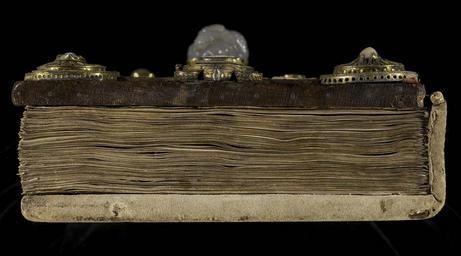 | Keywords: MCC-61050 Evangeliarium (Lebuïnuscodex) (316).jpg Artwork nl Anonymous Noordoost-Frankrijk Anonymous Rijnland Anonymous Maasland nl De kern van de boekband van de Lebuïnuscodex wordt gevormd door twee eikenhouten platten De rug en het achterplat zijn overtrokken met zeemleer Het voorplat is rijkelijk versierd met verguld zilversmeedwerk reliëfs van walrustand en verscheidene stenen De compositie van de bekleding van het voorplat wordt bepaald door een verguld zilveren filigraankruis Aan de uiteinden van de kruisarmen bevinden zich vierpassen met overhoeks vierkant eveneens met filigraan gedecoreerd Hiervan zijn er slechts twee bewaard gebleven en wel die aan de verticale kruisarmen Zij bevatten tevens nog de oorspronkelijke versiering bestaande uit een filigraanmedaillon met een pseudo-camee van respectievelijk een mannen- en een vrouwenhoofd in profiel Het snijpunt van het kruis wordt ingenomen door een ver vooruitstekend Bacchuskopje in chalcedoon te herkennen aan de kleine druiventrosjes in zijn haartooi Het kopje is gevat in een filigraanmedaillon welke op zijn beurt weer is geplaatst op een vierpas van filigraanwerk Op elk van de kruisarmen bevindt zich een ovale steen 'en cabochon' op een medaillon met filigraan Het filigraanwerk van kruis en sierstukken is in de vorm van visblazen In de ruimten tussen de kruisarmen zijn rechthoekige reliëfs van walrustand aangebracht met de vier evangelisten en hun symbool De reliëfs hebben de volgende afmetingen H 10 0 x B 5 5 cm Van links boven naar rechts onder betreft het Mattheus met de engel Johannes met de adelaar Marcus met de gevleugelde leeuw en Lucas met de gevleugelde os De figuren zijn paarsgewijs als elkaars spiegelbeeld ten opzichte van de middenas geplaatst Mattheus en Johannes zitten vrijwel geheel frontaal terwijl Marcus en Lucas meer in profiel zijn afgebeeld Qua opbouw verschillen de vier reliëfs nauwelijks van elkaar Binnen een rand van vierlobbige blaadjes verheffen zich twee zuilen met een basis een kapiteel en een dekplaat Hierop rust een rondboog geflankeerd door twee torens en afgedekt met een fronton dat boven Mattheus en Johannes boogvormig en boven Marcus en Lucas driehoekig is Onder deze overhuiving zitten de evangelisten gekleed in een lang gewaad en mantel met gekruiste benen aan een lessenaar hun blote voeten rustend op een bankje Allen zijn baardeloos en voorzien van een nimbus Voorts houden ze een pen in hun rechterhand terwijl hun linker op een boek ligt of gebarend is opgeheven Boven elk van de evangelisten verschijnt in de opening van het fronton zijn symbool met een spreukband Dit rijkelijk gedecoreerde middenveld wordt omlijst door sierbanden van verguld koper De opbouw van de sierlijsten is steeds dezelfde een opstaande smalle band die op regelmatige afstanden is voorzien van holten met aan weerszijden een brede strook voorzien van een gestanst motief Aan de lange zijden van de boekband bestaat het motief uit palmetten aan de korte zijden uit rozetten Van deze laatstgenoemde stroken ontbreekt steeds de buitenste rand Bij alle stroken met palmettenmotief wijzen de palmetten naar links met uitzondering van de buitenste strook rechtsboven die het motief in tegengestelde richting toont Verguld zilveren rozetten op de hoeken van het voorplat omgeven door een smalle rand van filigraanwerk met cirkelmotief en bekroond met een 'en cabochon' gezette steen completeren het geheel Van de rozet links onder ontbreekt de steen en is slechts de buitenste rand over Aan de voorzijde van de boekband bevinden zich nog de rudimenten van twee sluitingen between u'825' u'1000' u'1150' u'850' u'1199' u'1199' nl perkament eikenhout zilver goud koper walrustand chalcedoon glas leer Size 35 5 26 0 cm nl Hoogte 35 5cm Breedte 26 0cm Diepte 13 5cm Institution Museum Catharijneconvent object history exhibition history credit line nl Foto Museum Catharijneconvent Utrecht foto HetFotoAtelier Peter Rothengatter Reproduction title nl Boekband bovenzijde accession number Object number 61050 Inventory number ABM h1 place of creation https //www catharijneconvent nl/adlib/61050/ View this work on the website of Museum Catharijneconvent Museum Catharijneconvent Cc-zero <gallery> File MCC-61050_Evangeliarium_Lebuïnuscodex_ 11 jpg File MCC-61050_Evangeliarium_Lebuïnuscodex_ 172 jpg File MCC-61050_Evangeliarium_Lebuïnuscodex_ 212 jpg File MCC-61050_Evangeliarium_Lebuïnuscodex_ 61 jpg File MCC-61050_Evangeliarium_Lebuïnuscodex_ 12 jpg File MCC-61050_Evangeliarium_Lebuïnuscodex_ 213 jpg File MCC-61050_Evangeliarium_Lebuïnuscodex_ 56 jpg File MCC-61050_Evangeliarium_Lebuïnuscodex_ 232 jpg File MCC-61050_Evangeliarium_Lebuïnuscodex_ 93 jpg File MCC-61050_Evangeliarium_Lebuïnuscodex_ 99 jpg File MCC-61050_Evangeliarium_Lebuïnuscodex_ 184 jpg File MCC-61050_Evangeliarium_Lebuïnuscodex_ 64 jpg File MCC-61050_Evangeliarium_Lebuïnuscodex_ 299 jpg File MCC-61050_Evangeliarium_Lebuïnuscodex_ 86 jpg File MCC-61050_Evangeliarium_Lebuïnuscodex_ 260 jpg File MCC-61050_Evangeliarium_Lebuïnuscodex_ 159 jpg File MCC-61050_Evangeliarium_Lebuïnuscodex_ 247 jpg File MCC-61050_Evangeliarium_Lebuïnuscodex_ 180 jpg File MCC-61050_Evangeliarium_Lebuïnuscodex_ 121 jpg File MCC-61050_Evangeliarium_Lebuïnuscodex_ 315 jpg File MCC-61050_Evangeliarium_Lebuïnuscodex_ 284 jpg File MCC-61050_Evangeliarium_Lebuïnuscodex_ 33 jpg File MCC-61050_Evangeliarium_Lebuïnuscodex_ 44 jpg File MCC-61050_Evangeliarium_Lebuïnuscodex_ 258 jpg File MCC-61050_Evangeliarium_Lebuïnuscodex_ 237 jpg File MCC-61050_Evangeliarium_Lebuïnuscodex_ 20 jpg File MCC-61050_Evangeliarium_Lebuïnuscodex_ 220 jpg File MCC-61050_Evangeliarium_Lebuïnuscodex_ 279 jpg File MCC-61050_Evangeliarium_Lebuïnuscodex_ 183 jpg File MCC-61050_Evangeliarium_Lebuïnuscodex_ 60 jpg File MCC-61050_Evangeliarium_Lebuïnuscodex_ 166 jpg File MCC-61050_Evangeliarium_Lebuïnuscodex_ 97 jpg File MCC-61050_Evangeliarium_Lebuïnuscodex_ 71 jpg File MCC-61050_Evangeliarium_Lebuïnuscodex_ 13