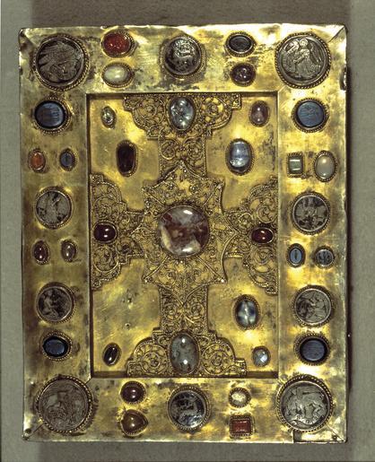 | Keywords: MCC-61090 Evangelistarium (Ansfriduscodex) (1).tif Artwork nl Anonymous Neder-Rijn Anonymous St Gallen OSB nl De kern van de boekband van de Ansfriduscodex wordt gevormd door twee eikenhouten platten Het voorplat bestaat uit een verdiept middenveld omgeven door een brede rand Het is beslagen met dunne verguld zilveren platen In het middenveld bevindt zich een verguld zilveren kruis met een verhoogd ingezwenkt achtkantig middenstuk en breed uitlopende armen Het kruis is versierd met filigraan en vijf halfedelstenen te weten een ronde steen van amethist en kornalijn op het snijpunt van de beide kruisarmen een lichtblauwe kwarts respectievelijk een agaat op de brede uiteinden van de verticale kruisarmen en twee nog niet nader bestemde stenen op de horizontale kruisarmen Het filigraanwerk bestaat uit cirkelvormige uitwaaierende ranken met bolletjes aan de uiteinden en in het midden hier en daar kleine rozetjes In de vier velden tussen de kruisarmen zijn steeds twee stenen in een diagonale lijn geplaatst Van boven naar beneden en van links naar rechts betreft het bergkristal en amethist amethist en kwarts kwarts de andere steen is verloren gegaan kwarts en amethist De brede rand rond het verdiepte middenveld is eveneens rijkelijk versierd Op de hoeken zijn geƫmailleerde medaillons met de evangelistensymbolen aangebracht De banderol die de figuren dragen vermeldt de naam van de evangelist Van links boven naar rechts onder betreft het de adelaar van Johannes de gevleugelde mens van Mattheus de gevleugelde leeuw van Marcus en de gevleugelde stier van Lucas Tussen de grote medaillons verdeeld over de lange en korte zijden van de rand bevinden zich zes kleinere geƫmailleerde medaillons Hiervan vormen de bovenste twee op de lange zijden tezamen de kroning van Maria links de gekroonde Moeder Gods en rechts de zegenende Christus Eronder bevinden zich twee medaillons waarop met wierookvaten zwaaiende engelen Op de korte zijden tonen de twee medaillons een afbeelding van een opspringend hert Op de rand bevinden zich verder nog vier alsengemmen met gegraveerde primitieve figuurtjes en zestien halfedelstenen waaronder kwarts amethist bergkristal jaspis en een lagensteen niccolo genaamd Zeven van deze stenen zijn voorzien van een gegraveerde mythologische voorstelling Zie Snijder 1932 voor een gedetailleerde beschrijving van de stenen en voorstellingen De rode rechthoekige jaspis in de onderrand bevat een koefische inscriptie die betekent 'Stel uw vertrouwen in Allah en zoek contact met den heer der getrouwen' Alle sierstukken alsmede de armen en de acht segmenten van het middenstuk van het kruis zijn omlijst met gedraaid gouddraad De rug en het achterplat zijn overtrokken met van oorsprong rood fluweel met rozenmotief Op het achterplat zijn vijf gegraveerde zilveren stukken aangebracht te weten vier ronde medaillons op de hoeken en in het midden een amandelvormige plaquette met een afbeelding van een bisschop omgeven door een rand met palmettenmotief In de buitenste rand staat de volgende Latijnse tekst gegraveerd ORNATU LAPIDUM RUTILANS AUROQUE POLITUM / PRAESULIS ANSFRIDI MARTINO MUNUS OBIVI vert 'versierd met flonkerende edelstenen en schitterend goud ben ik het boek een geschenk van bisschop Ansfridus aan Martinus de Utrechtse Martinuskerk' between u'950' u'1000' u'1000' u'1499' nl perkament eikenhout zilver goud kwarts amethist glas kornalijn bergkristal niccolo jaspis agaat fluweel Size 34 0 26 5 cm nl Hoogte 34 0cm Breedte 26 5cm Diepte 10 0cm Institution Museum Catharijneconvent object history exhibition history credit line nl Foto Museum Catharijneconvent Utrecht foto HetFotoAtelier Peter Rothengatter Reproduction title nl Boekband voorzijde accession number Object number 61090 Inventory number ABM h2 place of creation https //www catharijneconvent nl/adlib/61090/ View this work on the website of Museum Catharijneconvent Museum Catharijneconvent Cc-zero <gallery> File MCC-61090_Evangelistarium_Ansfriduscodex_ 319 tif File MCC-61090_Evangelistarium_Ansfriduscodex_ 157 tif File MCC-61090_Evangelistarium_Ansfriduscodex_ 103 tif File MCC-61090_Evangelistarium_Ansfriduscodex_ 279 tif File MCC-61090_Evangelistarium_Ansfriduscodex_ 250 tif File MCC-61090_Evangelistarium_Ansfriduscodex_ 104 tif File MCC-61090_Evangelistarium_Ansfriduscodex_ 96 tif File MCC-61090_Evangelistarium_Ansfriduscodex_ 276 tif File MCC-61090_Evangelistarium_Ansfriduscodex_ 114 tif File MCC-61090_Evangelistarium_Ansfriduscodex_ 233 tif File MCC-61090_Evangelistarium_Ansfriduscodex_ 195 tif File MCC-61090_Evangelistarium_Ansfriduscodex_ 261 tif File MCC-61090_Evangelistarium_Ansfriduscodex_ 73 tif File MCC-61090_Evangelistarium_Ansfriduscodex_ 105 tif File MCC-61090_Evangelistarium_Ansfriduscodex_ 40 tif File MCC-61090_Evangelistarium_Ansfriduscodex_ 231 tif File MCC-61090_Evangelistarium_Ansfriduscodex_ 48 tif File MCC-61090_Evangelistarium_Ansfriduscodex_ 43 tif File MCC-61090_Evangelistarium_Ansfriduscodex_ 50 tif File MCC-61090_Evangelistarium_Ansfriduscodex_ 1 tif File MCC-61090_Evangelistarium_Ansfriduscodex_ 198 tif File MCC-61090_Evangelistarium_Ansfriduscodex_ 144 tif File MCC-61090_Evangelistarium_Ansfriduscodex_ 293 tif File MCC-61090_Evangelistarium_Ansfriduscodex_ 109 tif File MCC-61090_Evangelistarium_Ansfriduscodex_ 318 tif File MCC-61090_Evangelistarium_Ansfriduscodex_ 254 tif File MCC-61090_Evangelistarium_Ansfriduscodex_ 301 tif File MCC-61090_Evangelistarium_Ansfriduscodex_ 107 tif File MCC-61090_Evangelistarium_Ansfriduscodex_ 284 tif File MCC-61090_Evangelistarium_Ansfriduscodex_ 251 tif File MCC-61090_Evangelistarium_Ansfriduscodex_ 121 tif File MCC-61090_Evangelistarium_Ansfriduscodex_ 172 tif File MCC-61090_Evangelistarium_Ansfriduscodex_ 213 tif File MCC-61090_Evangelistarium_Ansfriduscodex_ 264 tif File MCC-61090_Evangelistarium_Ansfriduscodex_ 118 tif File MCC-61090_Evangelistarium_Ansfriduscodex_ 90 tif File MCC-61090_Evangelistarium_Ansfriduscodex_ 287 tif File MCC-61090_Evangelistarium_A