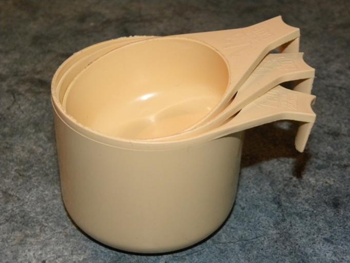 Keywords: MeasuringCups2.JPG en 3 plastic measuring cups labelled 1 cup 250 ml 1/2 cup and 1/3 cup own Vicki Nunn 2010-09-21 Food preparation Measuring cups Beige objects