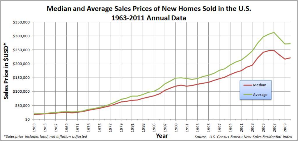 | Keywords: Median and Average Sales Prices of New Homes Sold in United States 1963-2008 annual.png  SVG en A graph showing the Median and Average Sales Prices of New Homes Sold in United States It shows the annual data from 1963 through 2008 It should be noted that the sales price includes the land This graph is made using the data from http //www census gov/const/uspriceann pdf The graph was made in excel http //www census gov/const/uspriceann pdf http //www mediafire com/ 7si89zm84plx3 Excel file 00 42 4 January 2010 UTC United States Census Bureau Public Domain File Median and Average Sales Prices of New Homes Sold in United States 1963-2008 annual pdf<br> File Median_and_Average_Sales_Prices_of_New_Homes_Sold_in_United_States_1963-2008 png for the monthly version The data is as follows center style background f0f0f0; Year center style background f0f0f0; Median center style background f0f0f0; Average - 1963 18 000 19 300 - 1964 18 900 20 500 - 1965 20 000 21 500 - 1966 21 400 23 300 - 1967 22 700 24 600 - 1968 24 700 26 600 - 1969 25 600 27 900 - 1970 23 400 26 600 - 1971 25 200 28 300 - 1972 27 600 30 500 - 1973 32 500 35 500 - 1974 35 900 38 900 - 1975 39 300 42 600 - 1976 44 200 48 000 - 1977 48 800 54 200 - 1978 55 700 62 500 - 1979 62 900 71 800 - 1980 64 600 76 400 - 1981 68 900 83 000 - 1982 69 300 83 900 - 1983 75 300 89 800 - 1984 79 900 97 600 - 1985 84 300 100 800 - 1986 92 000 111 900 - 1987 104 500 127 200 - 1988 112 500 138 300 - 1989 120 000 148 800 - 1990 122 900 149 800 - 1991 120 000 147 200 - 1992 121 500 144 100 - 1993 126 500 147 700 - 1994 130 000 154 500 - 1995 133 900 158 700 - 1996 140 000 166 400 - 1997 146 000 176 200 - 1998 152 500 181 900 - 1999 161 000 195 600 - 2000 169 000 207 000 - 2001 175 200 213 200 - 2002 187 600 228 700 - 2003 195 000 246 300 - 2004 221 000 274 500 - 2005 240 900 297 000 - 2006 246 500 305 900 - 2007 247 900 313 600 - 2008 232 100 292 600 - 2009 216 700 270 900 - 2010 221 800 272 900 PD-USGov Original upload log en wikipedia FtCG page en wikipedia Median_and_Average_Sales_Prices_of_New_Homes_Sold_in_United_States_1963-2008_annual png wikitable Date/Time Dimensions User Comment - 14 43 12 October 2011 921 × 438 37 120 bytes Smallman12q w en <nowiki> Updated </nowiki> - 01 07 4 January 2010 1 421 × 720 9 554 bytes Smallman12q w en <nowiki> Changed Costs to sales price </nowiki> - 00 42 4 January 2010 1 421 × 720 9 449 bytes Smallman12q w en <nowiki> A graph showing the Median and Average Sales Prices of New Homes Sold in United States It shows the annual data from 1963 through 2008 It should be noted that the sales price includes the land This graph is made using </nowiki> Diagrams in English Housing in the United States |