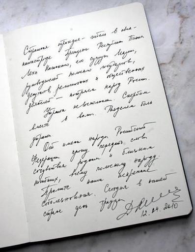 | Keywords: Medvedev inscription Polish embassy.jpg en Inscription of Dmitry Medvedev in book of condolence Polish embassy in Moscow April 12th 2010 wording see below pl Wpis do księgi kondolencyjnej Dmitrija Miedwiediewa ambasada RP w Moskwie 12 04 2010 treść p poniżej ru Ст ашная т агедия - гибель в авиакатаст офе П езидента Республики Польша Леха Качиньского его суп уги а ии уководителей польского госуда ства депутатов елигиозных и общественных деятелей - пот ясла на од России / Ут ата невосполнима Ско бим вместе с вами Разделяем боль ут аты / От имени на ода Российской Феде ации п ошу пе едать слова сочувствия одным и близким погибших всему польскому на оду П имите наши иск енние соболезнования Сегодня в нашей ст ане день т ау а / <подпись> / 12 04 2010 own Franciszek2010 2010-04-12 Mourning after 2010 Polish Air Force Tu-154 crash Dmitry Medvedev Condolence books |