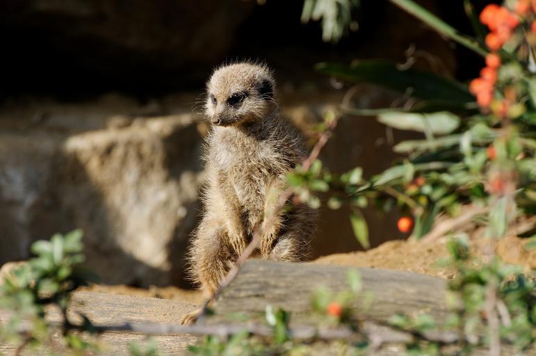 Keywords: meerkat rock sitting evening sun shrubs enclosure animal zoo