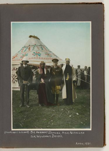 | Keywords: Meetings of British, Arab, and Bedouin officials in Amman, Jordan, April 1921 - File 06.tif en Photographs show meetings between Arab Bedouin and British officials around April 17-27 1921 at Amir Abdullah ibn Hussein's camp at Amman Jordan During these meetings British High Commissioner Herbert Samuel proclaimed Amir Abdullah as the ruler of Transjordan under British protection Among the persons depicted are Amir Abdullah John D Whiting possibly Sheik Sultan of the Belka Sultan ibn 'Ali id Diab ul 'Adwan Amir Shaker bin Zeid future Regent of Transjordan Bedouin chief Auda Abu Tayi Sheik Majid Pasha el Adwan Herbert Samuel British civil administrator Wyndham Deedes British diplomat Albert Abramson T E Lawrence Lawrence of Arabia and possibly Iraq civil administrator Gertrude Bell Also shown are horse racing an airplane landing at Abdullah's camp Circassian leaders Abudullah's bodyguard on camels and Herbert Samuel reading his proclamation of Abdullah as leader of Transjordan Reproduction Number LC-DIG-ppmsca-15304 digital files of original photos LC-DIG-ppmsca-15305 digital files of album pages Rights Advisory No known restrictions on publication Access Advisory For reference access please use the digital images in the online catalog to preserve the fragile original items Notes Photographs were created by the photographers of the American Colony Photo Department located in Jerusalem Founded in the late 1890s by Elijah Meyers the photo agency was headed during its heyday ca 1903-1933 by Lewis Larsson whose staff photographers included Erik Lind Lars Lind Furman Baldwin and G Eric Matson It transitioned into the Matson Photo Service around 1940 with photography by Matson Hanna Safieh Joseph H Giries and others John D Whiting contributed periodically to the work of both agencies The images in this album were probably taken by Lewis Larsson and/or Eric Matson For more information see http //hdl loc gov/loc pnp/pp matpc and http //www loc gov/rr/print/coll/629_whiting html Some caption information for these photographs based on information from matching negatives in the G Eric and Edith Matson Photograph Collection LC-M32-1942 LC-M32-1952 LC-M32-1951 LC-M32-1954 LC-M32-1956 M32-1957 and LC-M32-50280-x Album unpaginated album page numbers supplied by Library staff Pages 1-2 and verso of each page are blank One unattached photograph was found with the album and is stored with it Photograph is a portrait of a Jordanian man in traditional dress Blind stamp Hagop Berberian Amman Stamped on verso Copyright reserved By appointment to H M the King photographers Hagop Berberian Son More information about the events and people depicted in the album are available in the John D Whiting Supplementary Archive Box 1 LOT title devised by Library staff John D Whiting's diaries correspondence and other materials are located in the Library of Congress Manuscript Division Papers of John D Whiting Forms part of Visual materials from the papers of John D Whiting Library of Congress Transfer; Manuscript Division; 2006; DLC/PP-2006 051 29 Subjects Samuel Herbert Louis Samuel --Viscount --1870-1963 Lawrence T E -- Thomas Edward --1888-1935 Abdullah --King of Jordan --1882-1951 Deedes Wyndham Henry --Sir --1883-1956 Shākir ibn Zayd --Prince son of Zayd ibn Fawwāz Amir of Ṭāʾif --1885-1934 Bell Gertrude Lowthian --1868-1926 Jordan--History--1919-1946 American Colony Jerusalem --People--1920-1930 British--Jordan--Amman--1920-1930 Arabs--Jordan--Amman--1920-1930 Bedouins--Jordan--Amman--1920-1930 Circassians--Jordan--Amman--1920-1930 Tribal chiefs--Jordan--Amman--1920-1930 Meetings--Jordan--Amman--1920-1930 Camps--Jordan--Amman--1920-1930 Government officials--Jordan--Amman--1920-1930 Biplanes--Jordan--Amman--1920-1930 Proclamations--Jordan--Amman--1920-1930 April 17-27 1921 http //www loc gov/pictures/item/mpc2010001545/PP/resource/ Whiting John D John David 1882-1951 photographer Larsson Lewis photographer Matson G Eric Gästgifvar Eric 1888-1977 photographer other versions Wikimedia Levant - GLAM PD-Jordan 1921 Herbert Samuel and Amir Abdullah meetings |