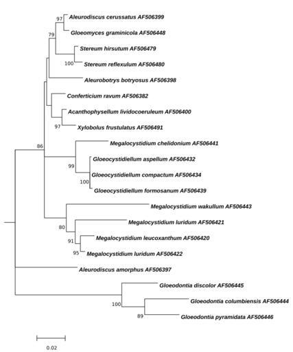 | Keywords: Megalocystidium-Mamximum-Likelihood-Tree.svg Megalocystidium Figure Molecular Phylogenetic analysis of Megalocystidium by the Maximum Likelihood method<br/> The evolutionary history was inferred by using the Maximum Likelihood method based on the Kimura 2-parameter model 1 The tree with the highest log likelihood -4055 6447 is shown The percentage of trees in which the associated taxa clustered together is shown next to the branches A user-specified tree was used as an initial tree in the heuristic search A discrete Gamma distribution was used to model evolutionary rate differences among sites 5 categories +G parameter 1 0022 The rate variation model allowed for some sites to be evolutionarily invariable +I 71 5627 sites The tree is drawn to scale with branch lengths measured in the number of substitutions per site The analysis involved 20 nucleotide sequences All positions with less than 95 site coverage were eliminated That is fewer than 5 alignment gaps missing data and ambiguous bases were allowed at any position There were a total of 1158 positions in the final dataset Evolutionary analyses were conducted in http //megasoftware net/ MEGA6 2<br/> 1 Kimura M 1980 A simple method for estimating evolutionary rate of base substitutions through comparative studies of nucleotide sequences Journal of Molecular Evolution 16 111-120 <br/> 2 Tamura K Stecher G Peterson D Filipski A and Kumar S 2013 MEGA6 Molecular Evolutionary Genetics Analysis version 6 0 Molecular Biology and Evolution30 2725-2729 <br/> http //www ncbi nlm nih gov/nuccore/AF506400 Acanthophysellum lividocoeruleum AF506400 http //www ncbi nlm nih gov/nuccore/AF506398 Aleurobotrys botryosus AF506398 http //www ncbi nlm nih gov/nuccore/AF506399 Aleurodiscus cerussatus AF506399 http //www ncbi nlm nih gov/nuccore/AF506382 Conferticium ravum AF506382 http //www ncbi nlm nih gov/nuccore/AF506432 Gloeocystidiellum aspellum AF506432 http //www ncbi nlm nih gov/nuccore/AF506434 Gloeocystidiellum compactum AF506434 http //www ncbi nlm nih gov/nuccore/AF506439 Gloeocystidiellum formosanum AF506439 http //www ncbi nlm nih gov/nuccore/AF506444 Gloeodontia columbiensis AF506444 http //www ncbi nlm nih gov/nuccore/AF506445 Gloeodontia discolor AF506445 http //www ncbi nlm nih gov/nuccore/AF506446 Gloeodontia pyramidata AF506446 http //www ncbi nlm nih gov/nuccore/AF506448 Gloeomyces graminicola AF506448 http //www ncbi nlm nih gov/nuccore/AF506441 Megalocystidium chelidonium AF506441 http //www ncbi nlm nih gov/nuccore/AF506420 Megalocystidium leucoxanthum AF506420 http //www ncbi nlm nih gov/nuccore/AF506421 Megalocystidium luridum AF506421 http //www ncbi nlm nih gov/nuccore/AF506422 Megalocystidium luridum AF506422 http //www ncbi nlm nih gov/nuccore/AF506443 Megalocystidium wakullum AF506443 http //www ncbi nlm nih gov/nuccore/AF506479 Stereum hirsutum AF506479 http //www ncbi nlm nih gov/nuccore/AF506480 Stereum reflexulum AF506480 http //www ncbi nlm nih gov/nuccore/AF506491 Xylobolus frustulatus AF506491 http //www ncbi nlm nih gov/nuccore/AF506397 Aleurodiscus amorphus AF506397 own 2014-09-09 Thkgk Cc-zero other versions Megalocystidium |