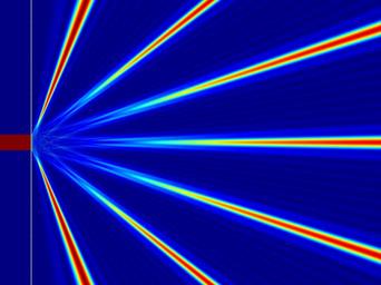 Keywords: Mehrfachspalt-Numerisch.png de Numerisch berechnete Intensitätsverteilung hinter einem Mehrfachspalt dargestellt als Hitzefeld Nicht berücksichtigt wurde die Freiraumdämpfung Deutlich zu erkennen die Hauptmaximas und dazu schwach die Nebenmaximas Hier wurde zur weiteren Veranschaulichung kein endliches Gitter sondern eine Wellenfront mit begrenzter Weite eingezeichnet In der Nähe des Gitter treten Alias-Effekte auf die wegen der begrenzten Auflösung entstehen 2014-03-15 18 01 33 own Miessen other fields MATLAB n + octave diffraction_grating m /usr/bin/octave -qf \usr\bin\octave Miessen 2014 getParameters function setParameters config global parameters; parameters grating_distance getConfigValue config grating_width ; parameters dim_x int32 getConfigValue config dim_x ; parameters dim_y int32 getConfigValue config dim_y ; parameters free_space_loss getConfigValue config free_space_loss ; parameters gap_width getConfigValue config gap_width ; parameters grating_count int32 getConfigValue config grating_count ; parameters grating_distance getConfigValue config grating_distance ; parameters offset_x int32 getConfigValue config offset_x ; parameters scaling_meter_per_px getConfigValue config scaling_meter_per_px ; parameters wave_length getConfigValue config wave_length ; endfunction findGapPositions function gaps findGapPositions grating_distance grating_count if grating_count < 2 error grating_count too small ; endif width grating_distance double grating_count -1 ; gaps ; for i 0 grating_count-1 gaps gaps i grating_distance-width/2 ; endfor endfunction gratingSignalStrength function amplitude gratingSignalStrength x y gaps wave_length free_space_loss grating gaps sub_steps gap_width free_space_loss not implemented calculate distances distances ; for gap_pos gaps distances distances sqrt y-gap_pos 2 + x 2 ; endfor calculate amplitudes c_amps ; base_distance sqrt x 2 + y 2 ; for d distances delay d - base_distance; phase 2 pi delay/wave_length; amplitude phasor c_amp residual rem d wave_length ; phase 2 pi residual/wave_length; c_amp complex cos phase sin phase ; c_amp c_amp / d; free_space_loss check - Integrate a slit c_amps c_amps c_amp; endfor calculate amplitude amplitude abs sum c_amps /length gaps ; eliminate free_space_loss max_sum sum abs c_amps /length gaps ; amplitude amplitude/max_sum; endfunction slitSignalStrength function amplitude slitSignalStrength x y sub_steps gap_width wave_length free_space_loss endfunction calculateDiffraction function amplitudes calculateDiffraction gaps printf Calculate Diffraction\n ; global parameters; Read globals dim_y parameters dim_y; dim_x parameters dim_x; scaling_meter_per_px parameters scaling_meter_per_px; offset_x parameters offset_x; wave_length parameters wave_length; free_space_loss parameters free_space_loss; Calculate dimensions x_max double dim_x - offset_x - 1 scaling_meter_per_px; y_width double dim_y - 1 scaling_meter_per_px; y_max y_width / 2 ; y_min -1 y_max; Initialize amplitudes zeros dim_y dim_x - offset_x ; for amp_pos_x int32 1 dim_x - offset_x printf 3d 100 amp_pos_x/ dim_x - offset_x ; for amp_pos_y int32 1 1 dim_y x double amp_pos_x scaling_meter_per_px; y y_min + double amp_pos_y scaling_meter_per_px; amp gratingSignalStrength x y gaps wave_length free_space_loss ; amplitudes amp_pos_y amp_pos_x amp; row y / column x endfor printf \b\b\b\b ; endfor printf Finished calculateDiffraction\n ; endfunction generateGrating function rgb generateGrating rgb printf Generate Grating\n ; global parameters; dim_y parameters dim_y; grating_count parameters grating_count; grating_distance parameters grating_distance; gap_width parameters gap_width; offset_x parameters offset_x; scaling_meter_per_px parameters scaling_meter_per_px; // gray zeros dim_y offset_x ; y_width double dim_y - 1 scaling_meter_per_px; y_max y_width / 2 ; even or odd if round rem grating_count 2 1 even_factor 0 5; grating_distance/2 ; else even_factor 0 ; endif for y_px int32 1 dim_y y double y_px scaling_meter_per_px; stepper y / grating_distance; normalize sub_stepper stepper + even_factor - round stepper ; sub_stepper rem stepper 1 ; stepper odd -0 5 +0 5 even 0 0 1 0 Nachkommazahlen sub_stepper +/- 0 5 grating_distance around gap for x_px offset_x-int32 double offset_x /40 offset_x if abs sub_stepper < gap_width rgb y_px x_px 0 0 0 ; else rgb y_px x_px 0 8 0 8 0 8; endif endfor endfor endfunction generateLaser function amplitudes generateLaser printf Generate Laser\n ; global parameters; dim_y parameters dim_y; grating_count parameters grating_count; grating_distance parameters grating_distance; offset_x parameters offset_x; scaling_meter_per_px parameters scaling_meter_per_px; y_width double dim_y - 1 scaling_meter_per_px; y_min -1 y_width / 2 ; laser_width grating_distance double grating_count amplitudes ; for y_px int32 1 dim_y y y_min + double y_px scaling_meter_per_px; if abs y < laser_width / 2 amplitudes amplitudes; ones 1 offset_x ; else amplitudes amplitudes; zeros 1 offset_x ; endif endfor endfunction M A I N global parameters begin_cputime cputime ; printf Including CSV library\n ; echo_csv_lib 0; source /lib/csv_lib m ; printf Including config library\n ; global echo_config_lib 0; source /lib/load_config_lib m ; printf Starting\n ; arg_list argv ; if rows arg_list 2 ; printf wrong parameters config file and output file needed \n ; exit ; endif config_filename arg_list 1 ; output_filename arg_list 2 ; config loadConfig config_filename ; config setParameters config ; gaps findGapPositions parameters grating_distance parameters grating_count ; gaps dim step wavelength printf Dimensions \n ; Debug x_width parameters scaling_meter_per_px double parameters dim_x y_width parameters scaling_meter_per_px double parameters dim_y amp gratingSignalStrength x_width 0 gaps parameters wave_length parameters free_space_loss ; amp diffractionMap calculateDiffraction gaps ; max max diffractionMap diffractionPowerMap diffractionMap 2; laserMap generate