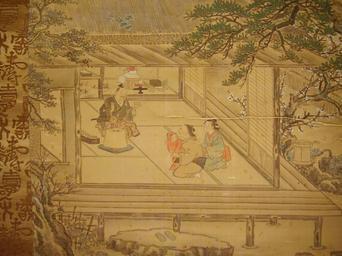 | Keywords: Meiji New Year Celebration.Wittig Collection.pntg-20.detail.jpg  en Detail interior view of a painting of an idealised traditional Japanese New Year celebration; it is somewhat unclear if the celebrations are being held on the old or new date for new year in Japan Chinese traditional or Western new year possibly this is intended as a depiction of an old date celebration given the tree-blossoms more spring-like vegetation; second half of the 19th century very late Edo period to Meiji era more probably Meiji ; painting is signed sealed artist not yet identified -- help needed ; handpainted on silk kakejiku scroll-mounted-painting own photograph; creator of the original artwork not yet identified Lx 121 18 - VERY late Edo to Meiji era PD-old image set of painting pending Paintings of the Meiji period New Year celebrations in Japan Kagami mochi |