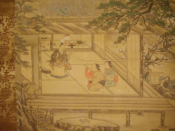 Keywords: Meiji New Year Celebration.Wittig Collection.pntg-20.detail.jpg en Detail interior view of a painting of an idealised traditional Japanese New Year celebration; it is somewhat unclear if the celebrations are being held on the old or new date for new year in Japan Chinese traditional or Western new year possibly this is intended as a depiction of an old date celebration given the tree-blossoms more spring-like vegetation; second half of the 19th century very late Edo period to Meiji era more probably Meiji ; painting is signed sealed artist not yet identified -- help needed ; handpainted on silk kakejiku scroll-mounted-painting own photograph; creator of the original artwork not yet identified Lx 121 18 - VERY late Edo to Meiji era PD-old image set of painting pending Paintings of the Meiji period New Year celebrations in Japan Kagami mochi |
