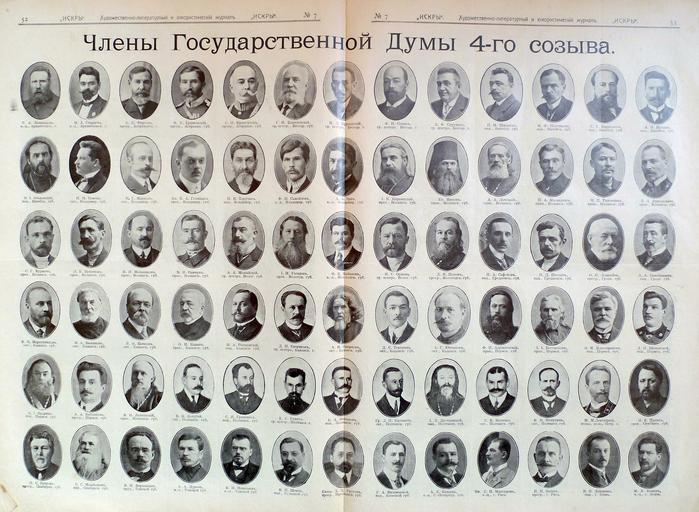 | Keywords: Members of State Duma IV 3.jpg ru Члены Госуда ственной Думы Российской импе ии 4-го созыва 1913 Художественно-лите ату ный и юмо истический жу нал Иск ы 7 17 фев аля 1913 года URL http //history-foto livejournal com/256038 html cutid1 author Custom license marker 2014 08 29 PD-RusEmpire Uploaded with UploadWizard Members of State Duma of the Russian Empire of the fourth convocation | ||||