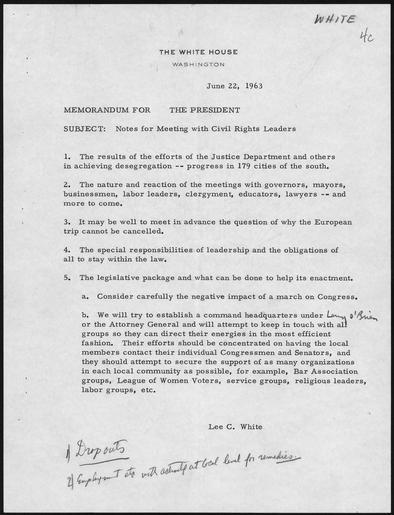| Keywords: Memorandum For The President Notes on Meeting with Civil Rights Leaders June 22, 1963 - NARA - 193807.tif Scope and content Memorandum by Lee C White on points to cover in meeting with Civil Rights leaders General notes 193807 Local identifier President 1961-1963 Kennedy Office of the Personal Secretary 1961 - 1963 NARA-Author White Lee C Lee Calvin 1923- Author 2362950 <br /> John F Kennedy Library NLJFK Columbia Point Boston MA 02125-3398 1963-06-22 Record group Collection JFK-POF Papers of John F Kennedy President's Office Files 01/20/1961 - 11/22/1963 Record group ARC 1166 Papers of President Kennedy President's Office Files Subjects compiled 01/20/1961 - 11/22/1963 Series ARC 193779 File unit Papers of President Kennedy President's Office Files Subjects Civil Rights General 1961 - 1963 File unit ARC 193805 Variant control numbers NAIL Control Number NLK-POF-SBJCTS-CRGENERAL-2CC yes Other versions NARA-cooperation PD-USGov Documents in English Lee C White |