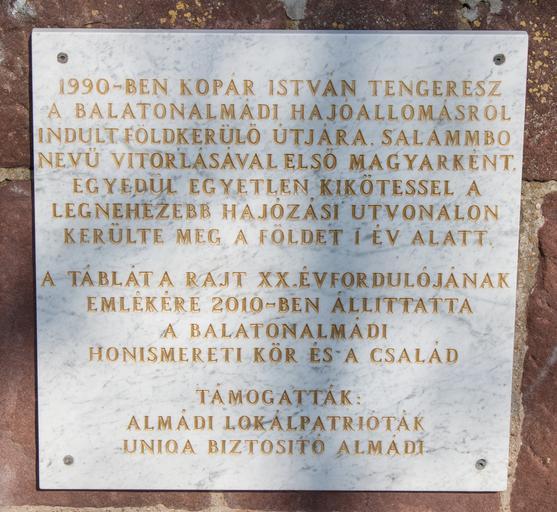 | Keywords: Memorial plaque of the circumnavigation by István Kopár in Balatonalmádi.jpg Memorial plaque of the circumnavigation by István Kopár in Balatonalmádi Kopár István Föld körüli hajózásának emléktáblája Balatonalmádi own 2014-02-24 Szilas FoP-Hungary Commonist Transport in Balatonalmádi Plaques in Veszprém County István Kopár 2010 works in Hungary | ||||