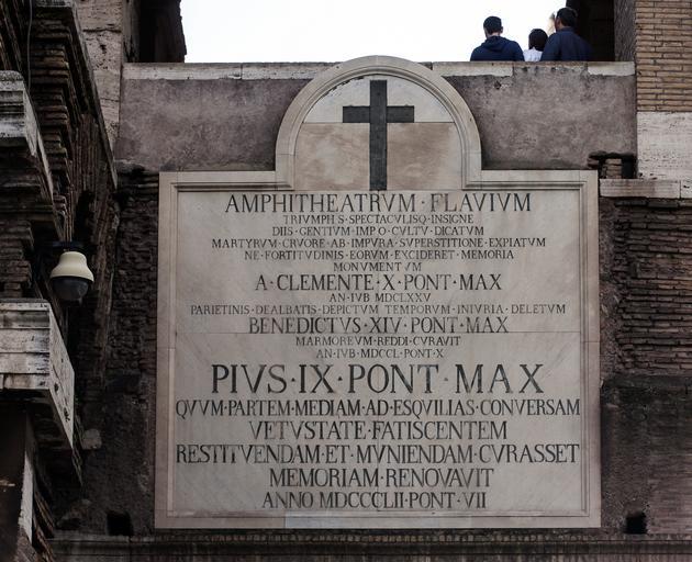 | Keywords: Memorial plate at the Colosseum.jpg sv Minnesplatta över insatser för Colosseums bevarande av pÃ¥varna Clemens X Benedictus XIV och Pius IX en Memorial plaque over the conservation of the Colosseum by popes Clement X Benedict XIV and Pius IX 2013-04-10 09 19 01 own cultural heritage Ž cc-zero Uploaded with UploadWizard Plaques at the Colosseum Taken with Canon EOS 40D | ||||