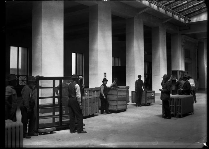 | Keywords: the field museum columbian move blackandwhite monochrome column colonnade architecture black and white Twelve (12) men unloading exhibit cases into a hall. Interior of exhibit hall in the new building with wood crates, radiators and windows visible, sign with "F" on one of the columns. Museum move series. 1920. Original size and material: 5x7 inch glass negative Digital Identifier: CSGN40508 Part of the Illinois Urban Landscapes Project: www.fieldmuseum.org/urbanlandscapes/ Twelve (12) men unloading exhibit cases into a hall. Interior of exhibit hall in the new building with wood crates, radiators and windows visible, sign with "F" on one of the columns. Museum move series. 1920. Original size and material: 5x7 inch glass negative Digital Identifier: CSGN40508 Part of the Illinois Urban Landscapes Project: www.fieldmuseum.org/urbanlandscapes/ |