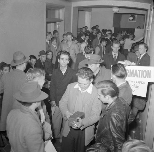 Keywords: Men waiting to enlist at recruiting headquarters in San Francisco, California, December 1941.jpg Men waiting to enlist at recruiting headquarters in San Francisco California December 1941 Note Presumably in response to the bombing of Pearl Harbor which resulted in the USA declaring war Photo by John Collier via Library of Congress website http //www loc gov/pictures/item/fsa2000052893/PP/; high res TIF converted to jpg border cropped and contrast adjusted before uploading to Wikimedia Commons 1941-12 John Collier PD-USGov 1941 in San Francisco December 1941 in the United States United States in World War II Fashion in 1941 |