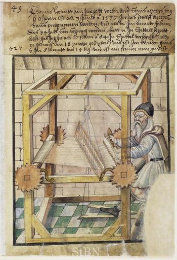 Keywords: Mendel II 043 r.jpg Thomas Holantt Holland parchett weber Barchentweber; Leinenweber; Weber Transkription und weitere Informationen siehe http //www nuernberger-hausbuecher de/75-Amb-2-317b-43-r/data Hausbuch der Mendelschen Zwölfbrüderstiftung Band 2 Nürnberg 1550 “1791 Stadtbibliothek Nürnberg Amb 317b 2° via http //www nuernberger-hausbuecher de/ 1584 anonymous PD-old-100 Hausbuch der Mendelschen Zwölfbrüderstiftung Band 2 Looms in art |