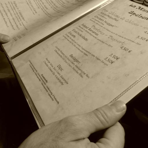 Keywords: menu beverage list local restaurant hand read decision choose euro prices offer