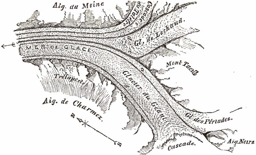 | Keywords: Mer de Glace sketchmap by John Tyndall, 1857, from 1896 edition.png Mer de Glace sketchmap by John Tyndall 1857 Fig 7<ref>Tyndall page 53 Fig 7 </ref> shows Aiguille Noire to the south bottom-right dividing the Cascade at the west bottom from Glacier des Périades right which flows north to join Glacier du Géant flowing south to north 14 degrees clockwise between Mont Tacul on the east centre right and Aiguilles de Charmoz to the west bottom alongside morraine 'b' This forms the medial morraine 'a' Some 3 kilometres downstream Glacier de Lechaud joins du Géant forming medial morraine 'c' Just prior to this confluence Cascade du Talèfre with its own medial morraine 'e' joins Lechaud forming morraine 'd' Here the glacier is known as the Mer De Glace and flows north-north-west leftwards between Aiguille du Moine on the east and Trélaporte on the west Notes 2 References cite book The Glaciers of the Alps John Tyndall 1896 Longmans Green and Co http //www archive org/details/glaciersalpsbeing00tyndrich 2008-02-29 PDF from http //www archive org/details/glaciersalpsbeing00tyndrich or alternative http //books google it/books id 8_cN1DQ3mZ4C printsec frontcover hl en PPA53 M1 1896 John Tyndall 1820-1893 PD-old Maps of glaciers Mer de Glace Glacier de Leschaux Glacier du Tacul Glacier de Trélaporte Glacier des Périades Glacier de Talèfre John Tyndall 1896 maps Maps of Haute-Savoie Engraved maps Maps of confluences of glaciers |