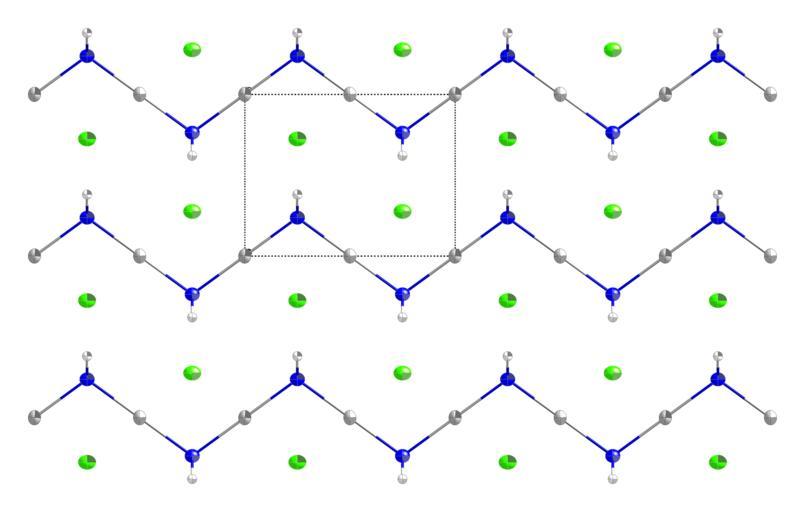 Keywords: Mercuric-amidochloride-from-xtal-2000-3D-CM-ellipsoids.png Thermal ellipsoid model of the unit cell and part of the crystal structure of mercuric amidochloride catena-Hg NH<sub>2</sub> Cl The thermal ellipsoids are drawn at the 50 probability level except the hydrogen atoms whose ellipsoids are quite large so I have replaced them with small spheres for clarity Colour code Mercury Hg grey Hydrogen H white Nitrogen N blue Chlorine Cl green Crystal structure from http //www3 interscience wiley com/journal/73501693/abstract Z anorg allg Chem 2000 626 2143 2145 <small>DOI <nowiki>10 1002/1521-3749 200010 626 10<2143 AID-ZAAC2143>3 0 CO;2-Z</nowiki></small> Model constructed and image generated in http //www crystalmaker com/ CrystalMaker 8 2 Own 2010-03-09 Ben Mills Benjah-bmm27 Images by Ben Mills Mercuric amidochloride Thermal ellipsoids Crystal structures of chlorides Crystal structures of mercury compounds