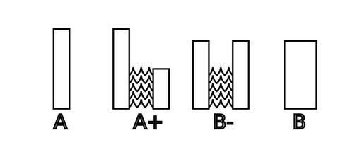 Keywords: MereAddition.svg du source XML The four situations A A+ B- and B of the en Mere Addition Paradox illustrated as bars of different widths and heights with water between in the case of A+ and B- following Parfit's book _Reasons and Persons_ chapter 19 2008-05-15 own assumed Fool~commonswiki Images - aspect ratio 5 2 SVG Mere addition paradox