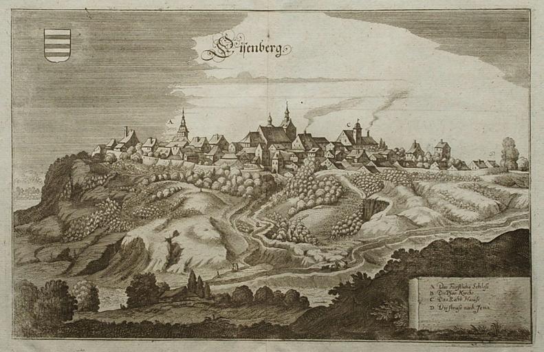 | Keywords: Merian eisenberg 1650 wikipedia.jpg  de Kupferstich 20 5 x 32 cm aus Merians Topographie 1650 Slg H -P Haack Leipzig 1650 Merian; Foto H -P Haack Leipzig 16 06 18 Aug 2007 CEST other fields 1 inscription inscription <big>Eisenberg</big><br />A Das Fürstliche Schloss<br />B Die Pfar Kirche<br />C Das Rath Hause<br />D Die Strase nach Jena de PD-old-100 Original upload log de wikipedia Merian+eisenberg+1650+wikipedia jpg wikitable - 2007-08-18 14 06 1053×682× 264909 bytes H -P Haack <nowiki> Information Kupferstich 20 5 x 32 cm aus Merians Topographie 1650 Slg ~~~ ~~~~ Bild-PD-alt Andere Versionen </nowiki> History of Eisenberg Thuringia Topographia Superioris Saxoniae Thüringiae Misniae et Lusatiae Merian Eisenberg |