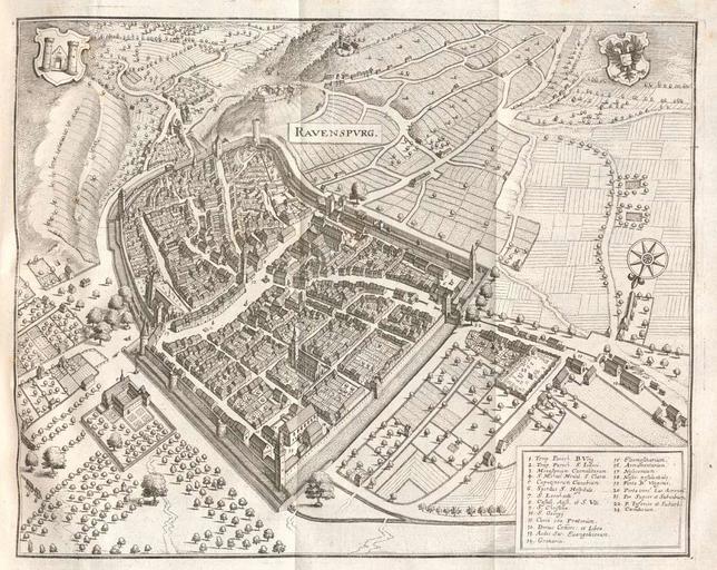 Keywords: Merian Ravensburg BSB.jpg Ravensburg in Zeiller/Merian Topographia Sueviae Frankfurt 1643 http //daten digitale-sammlungen de/bsb00042833/image_235 1643 Creator Matthäus Merian copied after David Mieser and Johann Morell's birdview of Ravensburg c 1630 PD-old-100 Merian Ravensburg |