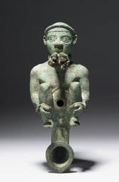 Keywords: Meroitic - Oil Lamp with Bound Prisoner - Walters 541549.jpg Elaborate oil lamps with figural attachments were common at the royal court in the ancient kingdom of Meroë This lamp depicts a captive nude prisoner his hands bound to his ankles The lamp would have been suspended by a chain from the collar around the figure's neck A Meroitic symbol perhaps an owner's mark is incised on the prisoner's shoulders between 700 200 BC bronze W 4 1/8 x D 3 9/16 x L 10 in 10 4 x 9 x 25 4 cm accession number 54 1549 11681 Guilhou Sale 1905 lot 307 said to be found in Egypt Henry Walters city Baltimore Walters Art Museum Henry Walters Acquired by Henry Walters 1905 place of origin Egypt Walters Art Museum license Ancient Egyptian art in the Walters Art Museum Meroitic art Archaeological bronze objects Ancient oil lamps POWs in Ancient Egypt |