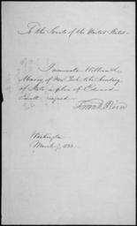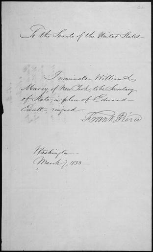 Keywords: Message of President Franklin Pierce nominating William L. Marcy, of New York, to be Secretary of State, 03-07-1853 - NARA - 306306.tif Local identifier U S Senate 03/04/1789 - Center for Legislative Archives NWL National Archives Building Room 8E 7th and Pennsylvania Avenue NW Washington DC 20408 1853-03-07 Record group Record Group 46 Records of the U S Senate 1789 - 2006 Record group ARC 375 Anson McCook Collection of Presidential Signatures compiled 1789 - 1975 Series ARC 306282 Variant control numbers NAIL Control Number NWL-46-MCCOOK-2 7 General notes Scope and content File unit File unit ARC yes NARA-cooperation PD-USGov Franklin Pierce 1853 in the United States |