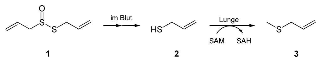 Keywords: Metabolisierung Allicin.svg Im Blut wird Allicin zu Allylmercaptan abgebaut Own 2008-05-26 Yikrazuul Metabolic pathways Allicin