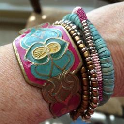 Keywords: metal jewelry gold gold jewelry metallic fashion wrist arm beads bracelet pink green wood glass beads accessories