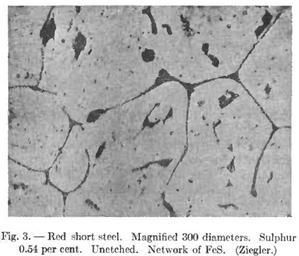 Keywords: Metallography of iron FeS inclusions.PNG en Inclusions of Iron sulphide FeS at the grain boundary on a red short steel fr Inclusions de sulfure de fer FeS au joint de grain sur un acier cassant à chaud http //www archive org/details/metallographyofi00sauvrich The metallography of iron and steel by Albert Sauveur Lesson VI page 5 Albert Sauveur 1912 PD-old PD-US Metallography of iron-based alloys |