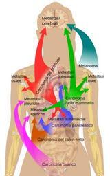 | Keywords: Metastasis sites for common cancers-IT.png  metastases for common cancer types Primary cancers are denoted by cancer except for skin melanoma and their main metastasis sites are denoted by metastases List of included information The included cancer types are the ones causing most death as per data from the US in 2008 <ref name Jemal> cite journal Jemal A Siegel R Ward E et al Cancer statistics 2008 CA Cancer J Clin 2008 71 “96 58 2 http //caonline amcancersoc org/cgi/content/full/58/2/71 18287387 10 3322/CA 2007 0010 </ref> Lung cancer mainly to adrenal glands brain and bone<ref>http //www atcs jp/pdf/2005_11_6/401 pdf http //www ncbi nlm nih gov/pubmed/16401990 PMID 16401990 Long-term survival cases of lung cancer presented as solitary bone metastasis </ref> Breast cancer mainly to bone liver lung and brain <ref name pmid17158753 > Cite journal Lacroix M Significance detection and markers of disseminated breast cancer cells Endocrine-related Cancer 13 4 1033 “67 2006 December 17158753 10 1677/ERC-06-0001 </ref> Colon cancer mainly to liver <ref>http //www cancer gov/cancertopics/factsheet/Sites-Types/metastatic Metastatic Cancer Questions and Answers fact sheet from the National Cancer Institute Reviewed 09/01/2004</ref> Pancreatic cancer mainly to liver and lungs <ref> http //emedicine medscape com/article/280605 Medscape > Pancreatic Cancer Author Tomislav Dragovich Chief Editor Jules E Harris Updated May 5 2011</ref> Melanoma mainly to brain<ref>http //www moffitt org/CCJRoot/v2n5/article3 html Melanoma Metastasis By Isaiah J Fidler Cancer Control Journal Vol 2 No 5 September/October 1995</ref> Ovarian cancer mainly to pleural cavity and liver<ref>http //jco ascopubs org/content/20/4/982 full pdf http //www ncbi nlm nih gov/pubmed/11844820 PMID 11844820 Epithelial Ovarian Cancer Metastasizing to the Brain A Late Manifestation of the Disease With an Increasing Incidence</ref> Not included information of major importance Prostate cancer in males usually metastasizes to the bones <ref name 'metastasis-route'> cite web http //www med-ed virginia edu/courses/path/gu/prostate3 cfm Male Genitals - Prostate Neoplasms 2011-04-28 Pathology study images University of Virginia School of Medicine http //www webcitation org/5yHQ19Rrp 2011-04-28 </ref> References reflist Metastasis_sites_for_common_cancers svg 2011-12-30 08 47 UTC Metastasis_sites_for_common_cancers svg Other versions Vector version available Metastasis sites for common cancers-IT svg </ref> Lung cancer mainly to adrenal glands brain and bone<ref>http //www atcs jp/pdf/2005_11_6/401 pdf http //www ncbi nlm nih gov/pubmed/16401990 PMID 16401990 Long-term survival cases of lung cancer presented as solitary bone metastasis </ref> Breast cancer mainly to bone liver lung and brain <ref name pmid17158753 > Cite journal Lacroix M Significance detection and markers of disseminated breast cancer cells Endocrine-related Cancer 13 4 1033 “67 2006 December 17158753 10 1677/ERC-06-0001 </ref> Colon cancer mainly to liver <ref>http //www cancer gov/cancertopics/factsheet/Sites-Types/metastatic Metastatic Cancer Questions and Answers fact sheet from the National Cancer Institute Reviewed 09/01/2004</ref> Pancreatic cancer mainly to liver and lungs <ref> http //emedicine medscape com/article/280605 Medscape > Pancreatic Cancer Author Tomislav Dragovich Chief Editor Jules E Harris Updated May 5 2011</ref> Melanoma mainly to brain<ref>http //www moffitt org/CCJRoot/v2n5/article3 html Melanoma Metastasis By Isaiah J Fidler Cancer Control Journal Vol 2 No 5 September/October 1995</ref> Ovarian cancer mainly to pleural cavity and liver<ref>http //jco ascopubs org/content/20/4/982 full pdf http //www ncbi nlm nih gov/pubmed/11844820 PMID 11844820 Epithelial Ovarian Cancer Metastasizing to the Brain A Late Manifestation of the Disease With an Increasing Incidence</ref> Not included information of major importance Prostate cancer in males usually metastasizes to the bones <ref name 'metastasis-route'> cite web http //www med-ed virginia edu/courses/path/gu/prostate3 cfm Male Genitals - Prostate Neoplasms 2011-04-28 Pathology study images University of Virginia School of Medicine http //www webcitation org/5yHQ19Rrp 2011-04-28 </ref> References reflist All imaged used are in the Public Domain Mikael Häggström derivative work Adert <span class signature-talk >talk</span> Traduzione in italiano Adert Metastasis_sites_for_common_cancers svg Cc-zero Original upload log This image is a derivative work of the following images File Metastasis_sites_for_common_cancers svg licensed with Cc-zero 2011-06-17T07 17 51Z Mikael Häggström 680x1090 1731797 Bytes <nowiki>Retry</nowiki> 2011-05-23T05 02 44Z Mikael Häggström 680x1090 1731797 Bytes <nowiki>Bunny-jumping because it won't accept my latest edit It's always the previous version that shows correct</nowiki> 2011-05-23T05 00 57Z Mikael Häggström 621x767 1234038 Bytes <nowiki>see above</nowiki> 2011-05-23T04 56 53Z Mikael Häggström 680x1090 1731797 Bytes <nowiki>Now it's to previous one that shows correct Reverting </nowiki> 2011-05-23T04 55 29Z Mikael Häggström 680x1090 1731797 Bytes <nowiki>No response so redid</nowiki> 2011-05-23T04 54 11Z Mikael Häggström 680x1090 1731797 Bytes <nowiki>Made pancreas arrows blue to distinguish from the red of lung cancer</nowiki> 2011-05-22T16 12 29Z Mikael Häggström 680x1090 1731827 Bytes <nowiki>darker green</nowiki> 2011-05-22T15 57 46Z Mikael Häggström 680x1090 1731823 Bytes <nowiki>Ups forgot to write out colorectal cancer</nowiki> 2011-05-22T15 55 36Z Mikael Häggström 680x1090 1727810 Bytes <nowiki> en f own Mikael Häggström f </nowiki> Uploaded with derivativeFX Metastasis |