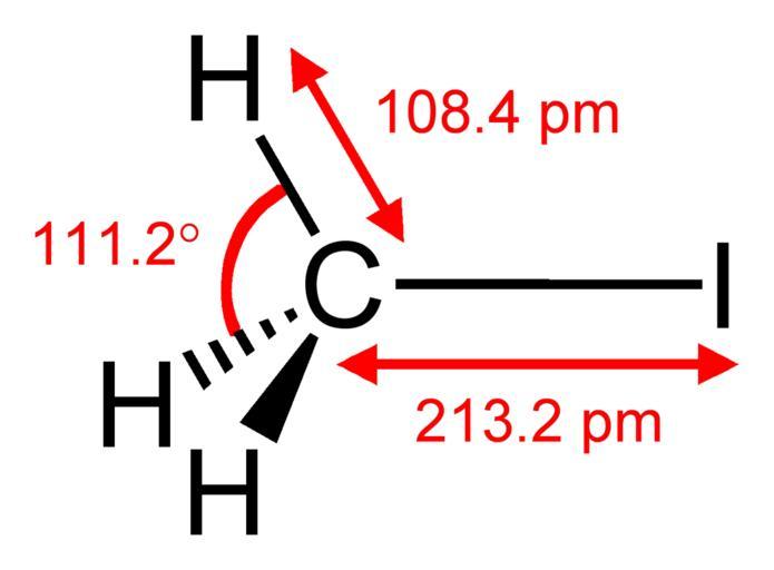 | Keywords: Methyl-iodide-CRC-MW-IR-dimensions-2D.png Structural formula of the methyl iodide iodomethane molecule MeI CH<sub>3</sub>I Structural information determined by microwave and infrared spectroscopy from http //www hbcpnetbase com/ CRC Handbook 88<sup>th</sup> edition Own 2009-03-15 Ben Mills Benjah-bmm27 Images by Ben Mills Iodomethane |
