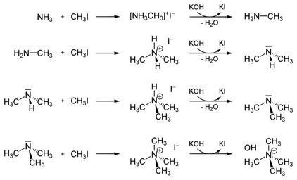 | Keywords: Methylation Ammonia.svg en Methylation of Ammonia via Iodomethane Finally Tetramethylammonium hydroxide is generated de Methylierung Ammoniaks via Methyliodid Am Ende erhält man Tetramethylammoniumhydroxid Own Yikrazuul 2008-07-26 Reactions of ammonia Methylation |