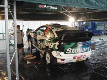Keywords: MEX 2008 RB 08 service 1.jpg Matthew Wilson's Ford Focus RS WRC 07 car is serviced prior to the start of the 2008 Rally Mexico at rally base in the Poliforum in Leon Mexico Own 2008-02-27 Joshbaumgartner 2008 Rally Mexico Ford Focus RS WRC 07 of Matthew Wilson in 2008 World Rally Championship automobile maintenance |