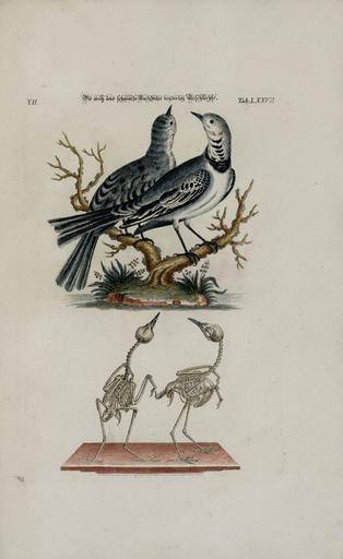 Keywords: Meyer Zeit-Vertreib 2 Tafel 077.jpg Angenehmer und nützlicher Zeit-Vertreib mit Betrachtung curioser Vorstellungen allerhand kriechender fliegender und schwimmender auf dem Land und im Wasser sich befindender und nährender Thiere sowohl nach ihrer Gestalt und äusserlichen Beschaffenheit als auch nach der accuratest davon verfertigten Structur ihrer Scelete oder Bein-Cörper nebst einer deutlichen so physicalisch und anatomisch besonders aber osteologisch und mechanischen Beschreibung derselben / nach der Natur gezeichnet gemahlet in Kupfer gestochen und verlegt von Johann Daniel Meyer Miniatur-Mahler in Nürnberg; Band 2; Nürnberg 1752<br /> Tafel 77 Weiß und schwarze Bachstelze http //resolver sub uni-goettingen de/purl PPN624675343 1752 Creator Johann Daniel Meyer PD-old-100 Angenehmer und nützlicher Zeit-Vertreib 2 Meyer Motacilla alba in art Passeriformes skeletons Motacillidae anatomy |