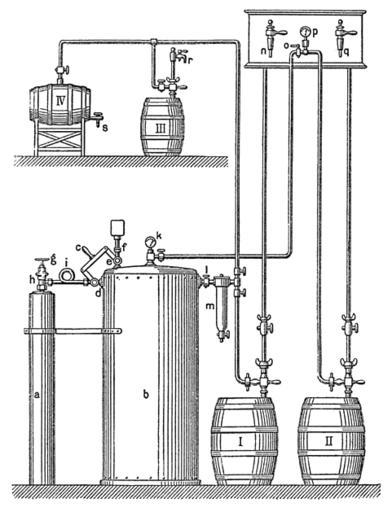 Keywords: Meyers b2 s0923 b1.png de Bierdruckapparat mit flüssiger Kohlensäure a “ schmiedeeiserne Druckflasche mit Kohlensäure b “ Windkessel c “ Handgriff d e g l o “ Hähne f “ Sicherheitsventil h “ Ventil i “ Rohr k p “ Manometer m “ gläsernes Gefäß n q r s “ Zapfhähne I II III IV “ verschiedene Arten des Ausschanks aus Fässern Meyers b2 s0923 jpg ca 1885 author PD-Meyers Beer barrels Images from Meyers Konversationslexikon 4th edition - text figures |