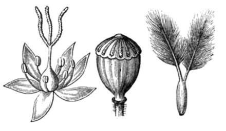 | Keywords: Meyers b3 s0069 b3.png  de links Narbenschenkel Mitte sitzende Narbe des Mohns rechts federförmige Narbe Meyers b3 s0069 jpg ca 1885 author PD-Meyers 19th-century flower diagrams Images from Meyers Konversationslexikon 4th edition - text figures |