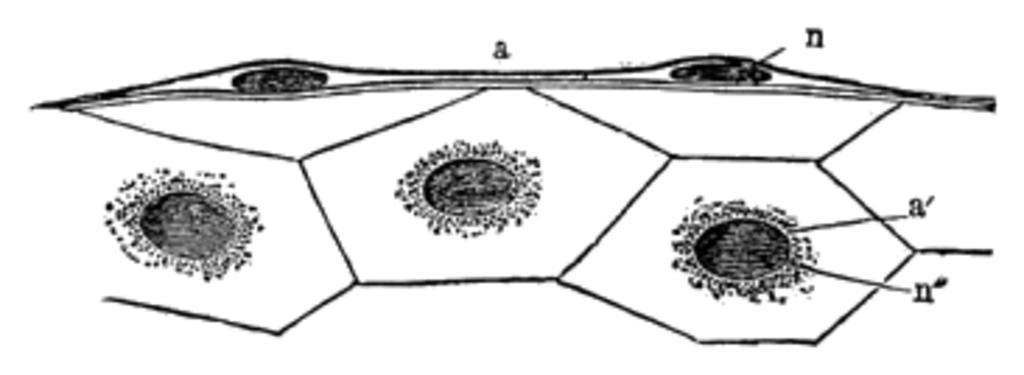 | Keywords: Meyers b5 s0708 b1.png de Pflasterepithel bei a von der Seite bei a ² von oben gesehen n Kern n ² Kernkörperchen Meyers b5 s0708 jpg ca 1885 author PD-Meyers Images from Meyers Konversationslexikon 4th edition - text figures Epithelial cells |