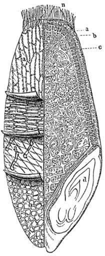 Keywords: Meyers b7 s0264 b1.png de Schematische Abbildung des Weizenkorns rechts im Querschnitt links in aufgerollten Schichten Meyers b7 s0264 jpg ca 1885 author PD-Meyers Images from Meyers Konversationslexikon 4th edition - text figures Triticum