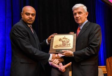 | Keywords: Dr. Srinivas Laxminarayan, Ph.D. at TATRC's BHSAI was awarded 3rd place for his presentation on "Preventing Heat Injuries by Predicting Human Core Temperature" at the MHSRS 2015 Young Investigator Competition. Photo by Melissa Myers, USAMRMC Public Affairs |