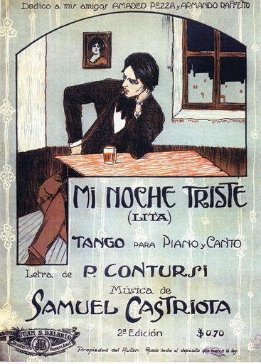 | Keywords: Mi noche triste groß.JPG en The score´s title of Mi noche triste the first tango-song Lyrics by Pascual Contursi; music by Samuel Castriota; recorded the first time by Carlos Gardel in may 1917 de Titelblatt der Partitur von Mi noche triste dem ersten Tangolied Text von Pascual Contursi; Musik von Samuel Castriota; erstmals aufgenommen von Carlos Garden im Mai 1917 Roberto Daus El Tango Medio siglo en imagenes Almendra Music S I Barcelona S 279 Author ~ 1915 Tango songs Pascual Contursi Samuel Castriota PD-Art |