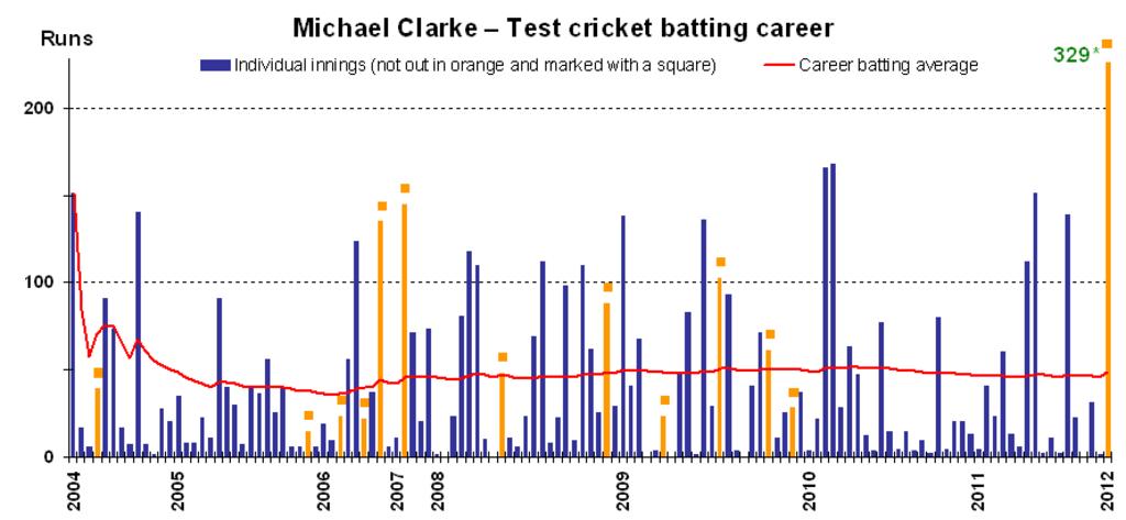MAKE A MEME View Large Image Michael Clarke batting v4.png test match performance of cricketer Michael Clarke and was created by en wiki w user EdChem Each bar indicates a single test match innings blue ones for innings in which he was dismissed orange ones for innings ...