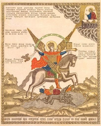 | Keywords: Michael Lubok.jpg ru Святой А хист атиг ихаил Г озных сил воевода 1820-1830-е Офо т езец аск ашенный оттиск s 1830 http //nashenasledie livejournal com/1709336 html author Custom license marker 2012 12 28 PD-art-100 Uploaded with UploadWizard Religious lubok Icons of Saint Michael horseman Michael Day in Russia |