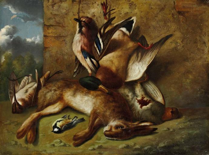| Keywords: Michelangelo Meucci - Natura morta (1887).jpg oil canvas cm 53 72 accession number object history credit line M Meucci Firence 1887 ~ lower right signature and date http //www dorotheum com/dailyauction/lot-detail/lotID/9999/lot/1555873-michelangelo-meucci/e1/gemaelde/e2/oelgemaelde-19-jahrhundert html no_cache 1 sort date cHash 986cd8a989041a6869e7ad6e6b66363b Palais Dorotheum Linz 2013 08 21 lot 194 PD-old-100 Still life paintings of animals 19th-century still life paintings Images from Dorotheum |