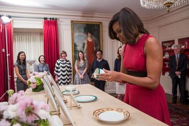 Keywords: obama china service obamachinaservice white house china whitehousechina pickard china pickardchina 2015 white house china 2015whitehousechina porcelain american porcelain americanporcelain white house porcelain whitehouseporcelain obama porcelain obamaporcelain indoor First Lady Michelle Obama inspects the new White House china in the China Room of the White House in Washington, D.C., in the United States on April 27, 2015. This photograph was taken by Amanda Lucidon, a photographer in the employ of the White House. As the work of an employee of the federal government created in the performance of his/her duties, it is in the public domain. The White House must order new china about once every 10 years, depending on wear and tear. Recent past colors have included celadon green (Truman), white (with flowers; Johnson), red (Reagan), gold (Clinton), and gold (G.W. Bush). Although dark blue has been used on previous orders of White House china (both the F.D. Roosevelt and Wilson services used it), the type of light blue used by the Obamas has never been used before on American state china. The new Obama service porcelain was designed by First Lady Michelle Obama, with assistance from her friend, the interior designer Michael S. Smith. Planning for the new china began in the fall of 2011, and Obama consulted White House chefs (past and present), White House staff, and the Pickard China company of Illinois on the design and style of the porcelain, pieces, and color. White House dinners are growing ever-larger in size. Existing White House china settings are often used together, mixed and matched so that 400-, 500-, and even 600-setting dinners can be given. Michelle Obama was constrained by the need to design a china service that mixed well with existing china, but which reflected the Obamas' own personal style and tastes. The Obama china service made its debut on April 27, 2015. It was first used on April 28 for a state dinner for Japanese Prime Minister Shinzo Abe. Each setting has 11 pieces and there are 320 settings, for a total of 3,520 pieces in the entire service. The "service plate" or "charger" is the largest piece in the set at 14 inches. A charger is designed to be a placeholder, so that each diner knows to "sit here". As the meal is served, additional elements of the service are placed atop the charger. The charger helps protect the tablecloth from spills, but it also helps act as an aesthetic backdrop to the other pieces of china. The Obama chargers feature a lip of gold gilt, impressed with a fret (Greek key pattern). There is a narrow band of plain gilt on the rim next to the lip, with the rest of the rim in fluted gold gilt. A narrow band of plain gold gilt is placed just inside the well. In the center of the charger is the Presidential coat of arms in gold. The seal should be the first thing the diner sees when they are seated. Each dinner plate is 12 inches in diameter. The lip of the dinner plate is plain gold gilt. The broad rim of the plate lacks gilding or color, and is decorated with pinwheels and fronds in bas-relief. The bas-relief design was taken from an Empire-style china service purchased by then-Secretary of State James Madison in 1806. The bas-relief element is unique to White House china, which has never featured anything like it before. The Obama china service also includes a "second course" 11-inch dinner plate, a 10-inch luncheon plate, a 9-inch salad plate, a 9-inch dessert plate, a 7-inch tureen plate, and a 6-inch saucer. Each of these plates has a lip in gold gilt, impressed with a fret-oval-and-dart motif. Each motif is separated by a double row of dots. The rim of the plate is in a new color designed specifically for the Obama china service. This color is named "Kailua Blue," a bright blue inspired by the hue of the sea in President Barack Obama's home state of Hawaii. The fluted rim of blue is followed by a delicate inner line of gold gilt which completes the decoration. Only about half the rim is taken up by design and color. The dessert plate, the last plate the diner should see, also has the Presidential coat of arms in gold gilt in the center. Each setting comes with a coffee cup. The cup has a lip of plain gold gilt, followed by a narrow band of gold gilt in a dart-oval-dart motif set perpendecular to the lip. This is followed by a band of fluted Kailua blue, and then a delicate band of plain gold gilt again. Each cup has the Presidential coat of arms; if held by the right hand, the coat of arms faces the guest. Unique to the Obama china service is an individual tureen. Although large tureens have been part of White House china before, this is the first time an individual-sized tureen has been designed. The tureen reflects a more modern style of dining, which emphasizes soups, small entrees, or desserts requiring more than a bowl but not a large tureen. Each tureen is small, about 6 inches across. Handles on the side of the tureen are plain, consisting of a scroll with one acanthus leaf above and three below (helping to reinforce the scroll). Each tureen is about 4 inches deep. The lip of the tureen is plain. The rim is designed with the same plain pinwheels-and-fronds design in bas-relief. Below the rim, the side of the tureen is decorated with a narrow band of Kailua blue edged in a delicate line of gold gilt. The lid of the tureen is plain, with a mushroom-motif handle. The cap of the mushroom is fluted, with a botton topping the cap. Pickard China produced the dinnerware. The tureen was incredibly difficult to make. It took workers more than a year and innumerable trials to produce the tureen. The china service was paid for by the White House Historical Association -- a private foundation established by Jacqueline Kennedy to buy furniture, china, and decorative and fine art for the White House. The service cost $367,258. First Lady Michelle Obama inspects the new White House china in the China Room of the White House in Washington, D