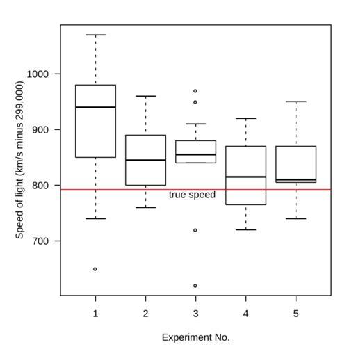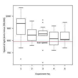 | Keywords: Michelsonmorley-boxplot.svg Boxplot representing Michelson's data on the speed of light It consists of five experiments each made of 20 consecutive runs 2006-12-28 own User Schutz This data is not from the Michelson-Morley experiment but from Michelson's measurement of the speed of light See MICHELSON A A 1882 Experimental determination of the velocity of light made at the United States Naval Academy Annapolis Astronomic Papers 1 pp 109-145 U S Nautical Almanac Office or S M Stigler 1977 Do robust estimators work with real data Annals of Statistics 5 1055 “1098 Original upload by User Schutz Boxplot representing Michelson's data on the speed of light It consists of five experiments each made of 20 consecutive runs Note that the oblique line is incorrect and probably due to a bug in the Mediawiki software/SVG converter The graphic was created by User Schutz for Wikipedia on 28 December 2006 using the http //www r-project org/ R statistical project The program that generated the graphic is given below; the data and the idea are from the R help page for the <tt>morley</tt> dataset see <tt>help morley </tt> The graph was exported in postscript format converted to SVG using the <tt>pstoedit</tt> command and the layout was slightly modified using Inkscape before upload <nowiki> data morley morley Expt <- factor morley Expt morley Run <- factor morley Run attach morley postscript Michelsonmorley-boxplot ps paper special height 6 width 6 horizontal F par las 1 par mar c 5 1 5 1 2 1 2 1 par font 2 par font axis 2 boxplot Speed ~ Expt xlab Experiment No ylab Speed of light km/s minus 299 000 abline h 792 458 lty 3 dev off </nowiki> New upload by User Mwtoews Boxplot representing Michelson's data on the speed of light It consists of five experiments each made of 20 consecutive runs The graphic was originally created by User Schutz for Wikipedia on 28 December 2006 using the http //www r-project org/ R statistical project The program that generated the graphic is given below; the data and the idea are from the R help page for the <tt>morley</tt> dataset see <tt>help morley </tt> The graph was exported in PDF format converted to SVG using Adobe Illustrator and the layout was slightly modified using Vim before upload <pre> data morley morley Expt <- factor morley Expt pdf Michelsonmorley-boxplot pdf height 6 width 6 par las 1 mar c 5 1 5 1 2 1 2 1 boxplot Speed ~ Expt morley xlab Experiment No ylab Speed of light km/s minus 299 000 abline h 792 458 col red text 3 792 458 true\nspeed dev off </pre> The creator and uploader also believes that this graphic is a trivial work which does not qualify for copyright Reference A J Weekes 1986 A Genstat Primer London Edward Arnold Created with R Box plots famous experiments Michelson-Morley experiment Outliers |