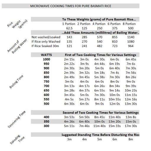 MAKE A MEME View Large Image Microwave Rice Cooking Chart Pure Basmati.PNG A rice cooking chart for the use of microwave ovens specifically for Pure Basmati rice It provides for differences in wattage and serving amount and allows for differences in whether or not the ...