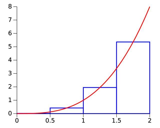 | Keywords: MidRiemann2.svg en A middle Riemann sum of x 3 over 0 2 using 4 subdivisions Own Qef 2009-06-21 Shows same thing as this bitmap version file MidRiemann2 PNG Gnuplot source <pre> set terminal svg font Bitstream Vera Sans 18 set output MidRiemann2 svg set xrange 0 2 set yrange 0 8 set xzeroaxis linetype -1 set yzeroaxis linetype -1 set xtics axis nomirror offset 0 0 5 set ytics axis nomirror offset -0 5 0 set key off set border 0 set samples 100 plot '-' using 1 1 1 1 with boxes fill linetype rgbcolor blue linewidth 3 0 25 0 75 1 25 1 75 e plot x x x with line linetype rgbcolor red linewidth 3 </pre> Qef Riemann integral Images with Gnuplot source code |