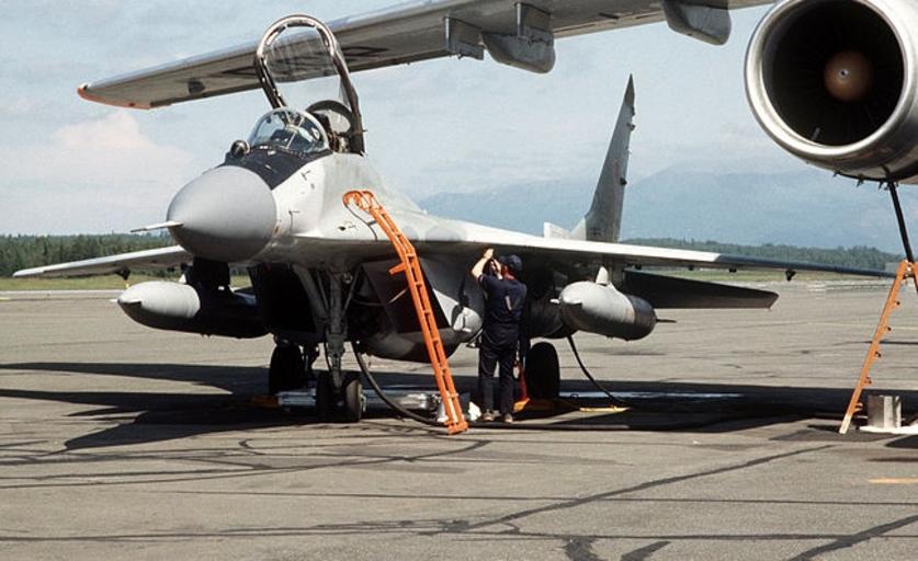 MAKE A MEME View Large Image MiG-29 refuelling-2.jpg A Soviet technician works on a MiG-29A Fulcrum aircraft as it receives fuel from an IL-76MD Candid-B aircraft The aircraft has stopped at the base while en route to an air show in Canada Location ELMENDORF AIR FORCE ...