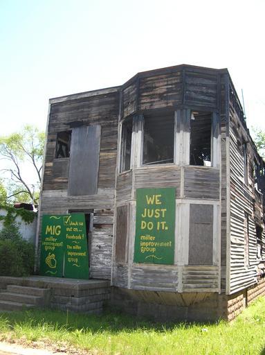 Keywords: MIG burnout.jpg en Burned-out and abandoned building on Lake Street in downtown Miller Beach Gary Indiana secured by the Miller Improvement Group Own Visviva 2011-06-13 Cc-zero Abandoned houses Abandoned buildings in Gary Indiana